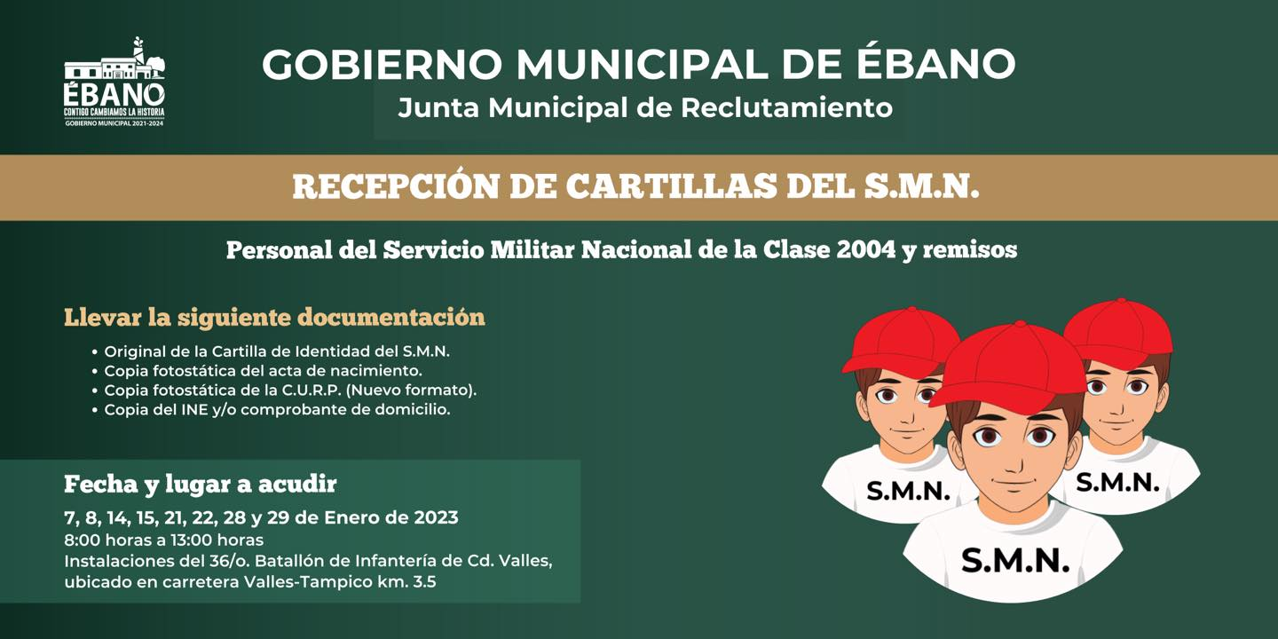 El Gobierno Municipal de Ébano que preside la alcaldesa María Soledad Carreño Linares, en coordinación con la Junta Municipal de Reclutamiento del municipio de Ébano, informa las fechas de Recepción de Cartillas del S.M.N. Para personal de la clase 2004 y remisos en las instalaciones del 36/o. Batallón de Infantería